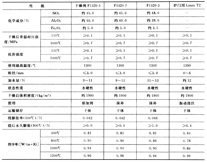 目前,我国生产的耐火浇注料种类较多,黏土质和高铝质致密耐火浇注料是以黏土质和高铝质原料制成的致密耐火浇注料,其理化指标见表1.